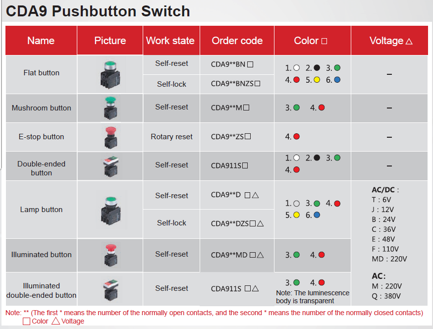 There are complete specifications and various accessories for CDA9 pushbutton switches. The product complies with CCC/CE/ROHS IP65 high protection grade. A series that integrates perfect appearance and excellent performance – with three advantages of perfect industrial design, safety and reliability, and convenient operation, a special symbolic button can be customized for elevators.