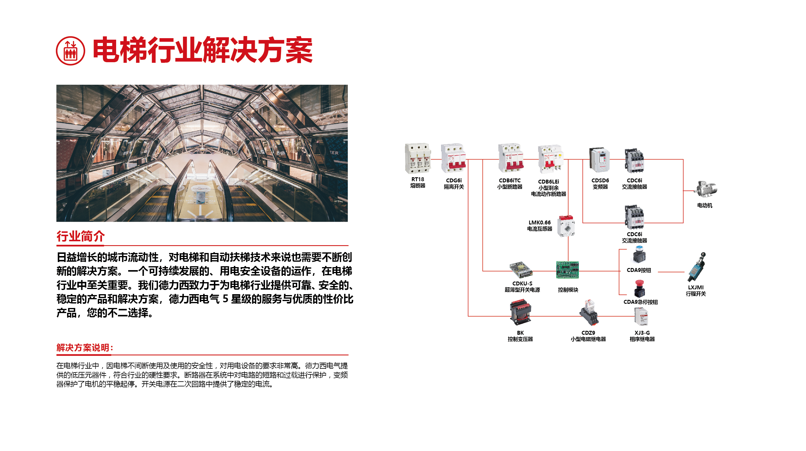 In the elevator industry, the requirements for electrical equipment are very high due to the uninterrupted operation and safety of use of elevators. Low-voltage components provided by Delixi Electric meet the necessary requirements of the industry. The circuit breaker protects the circuit from short circuits and overloads in the system, and the inverter ensures the smooth start and stop of the motor. The switching power supply provides a stable current in the secondary circuit.