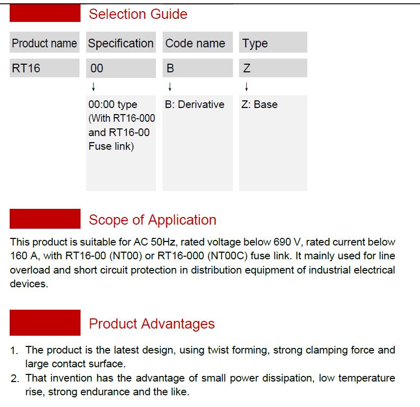 The product is suitable for AC 50Hz RT16-00 (NT00) or RT16-000 (NT00C) fuse with a rated voltage 690V and below and a rated current 160A and below, and mainly used in the distribution equipment of industrial electrical installations for line overload and short circuit protection.