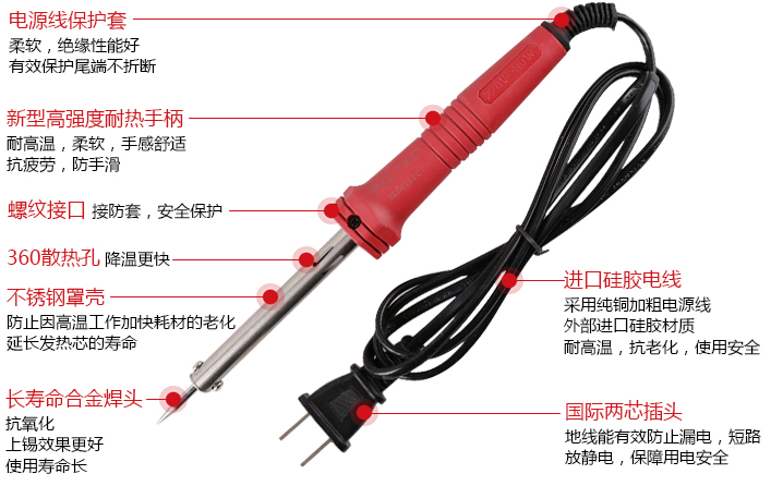 It is the necessary tools for electronic production and electrical maintenance, and its main purpose is welding components and wires. It can be divided into internal heat type electric soldering iron and external heat type electric soldering iron and adjustable-temperature type electric soldering iron according to the mechanical structure. Delixi electric soldering iron series has the characteristics of fast heating, good hand feeling, fast heat transfer, light weight and small size, and high work efficiency.