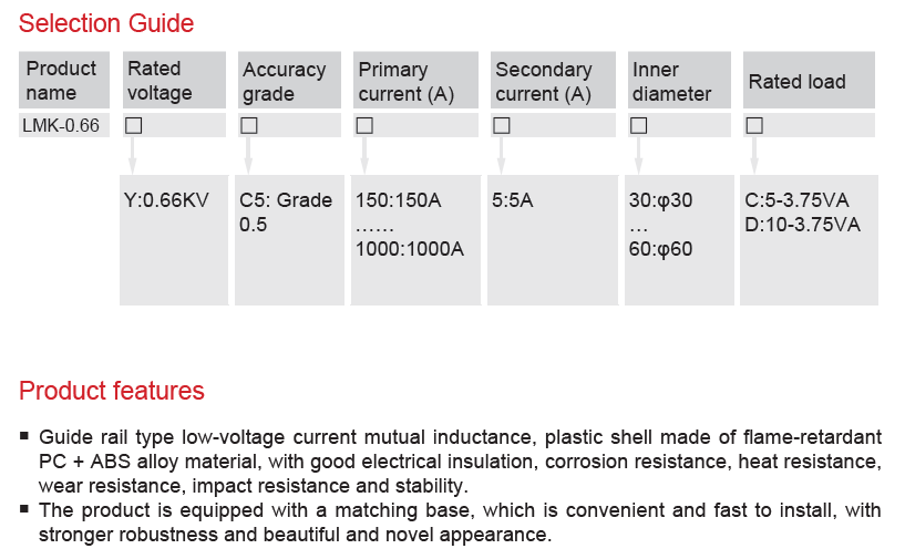 For rail type low-voltage current transformer, its plastic shell is made of PC flame retardant alloy material with good electrical insulation, corrosion resistance, heat resistance, wear resistance, impact resistance, and stability. The product has a matching base for easy and quick installation, stronger consistency, and artistic and novel appearance. It is suitable for 66kV and below AC circuits for measuring and monitoring current and electric energy, and the product performance conforms to the standard GB 20840.1&2