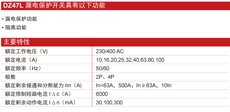 DZ47L leakage protection switch is suitable for AC 50/60Hz line with a rated voltage 230V for two-pole or a rated voltage 400V for four-pole and with a rated current up to 100A. When the electric shock occurs or the grid leakage current exceeds the specified value, the earth residual current circuit breaker can work to quickly cut off the fault current in a very short time to protect the safety of people and electrical equipment, and it can also be used for infrequent conversion of the line and for infrequent start of the motor. Products are suitable for many places such as industrial, commercial, high-rise and residential buildings.