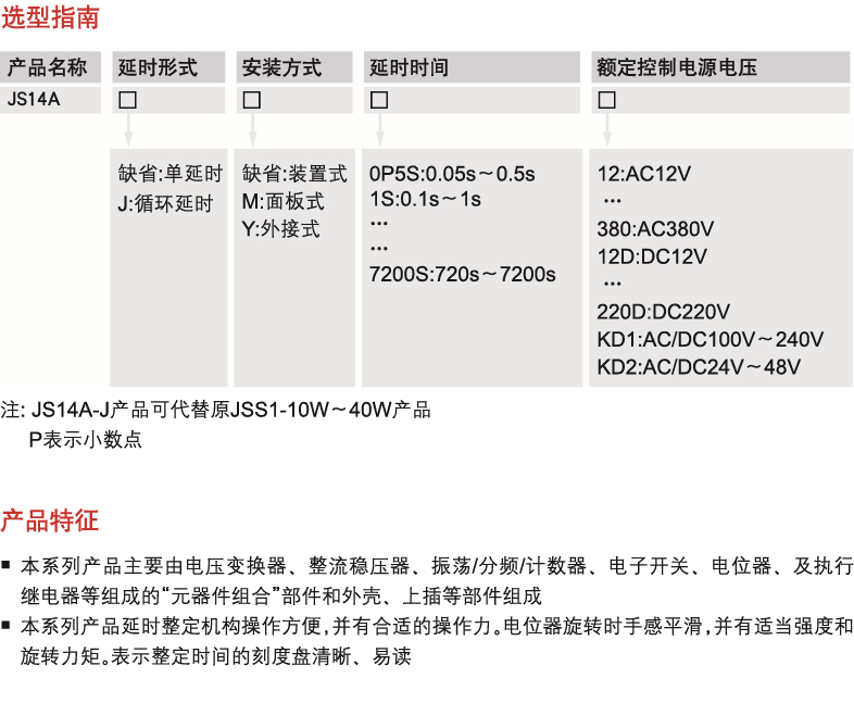 This series of products mainly consist of the "component combination" part composed of rectifier regulators, oscillators/ frequency divider /counters, electronic switch, potentiometer and actuator relay and the shell and the upper plug; This series product delay setting mechanism is easy to operate, and has appropriate operating force. Hands feel smooth when the potentiometer is rotating with appropriate strength and rotation moment, indicating that the setting time dial is clear and easy to read.