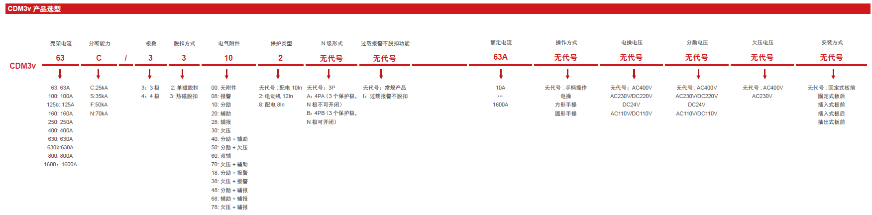 CDM3v moulded case circuit breaker is a mechanical switch used in the low-voltage distribution line can power on, carry and power off the current under normal circuit conditions, can also power on and carry the current for a certain time and power off the current for protection of lines and equipment in case of overload, short circuit, or undervoltage (accessory function) of the power distribution line. It is widely used in low-voltage power places such as electricity, construction, industry, and OEM.