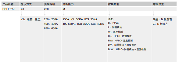 CDLE6YJ residual current operated circuit breaker (with metering module) with a rated insulation voltage 1000V is suitable for AC 50Hz power distribution network with a rated voltage up to 400V and a rated current up to 630A. It is used to provide indirect contact protection to prevent fire hazards caused by ground fault current occurred due to equipment insulation damage; it is also used for electric energy distribution and for protection of lines and power equipment to prevent hazards caused by faults such as overload, undervoltage, short circuit, and single phase grounding.
