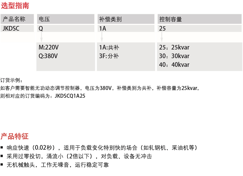 JKDSC series intelligent reactive power dynamic adjustment controller (no contact switch) has the characteristics of simple installation, convenient maintenance, fast response, no inrush current when switching, no working noise, and stable and reliable operation. It is suitable for three-phase dynamic (fast) co-compensation (380V) and three-phase dynamic (fast) sub-complement (220V).