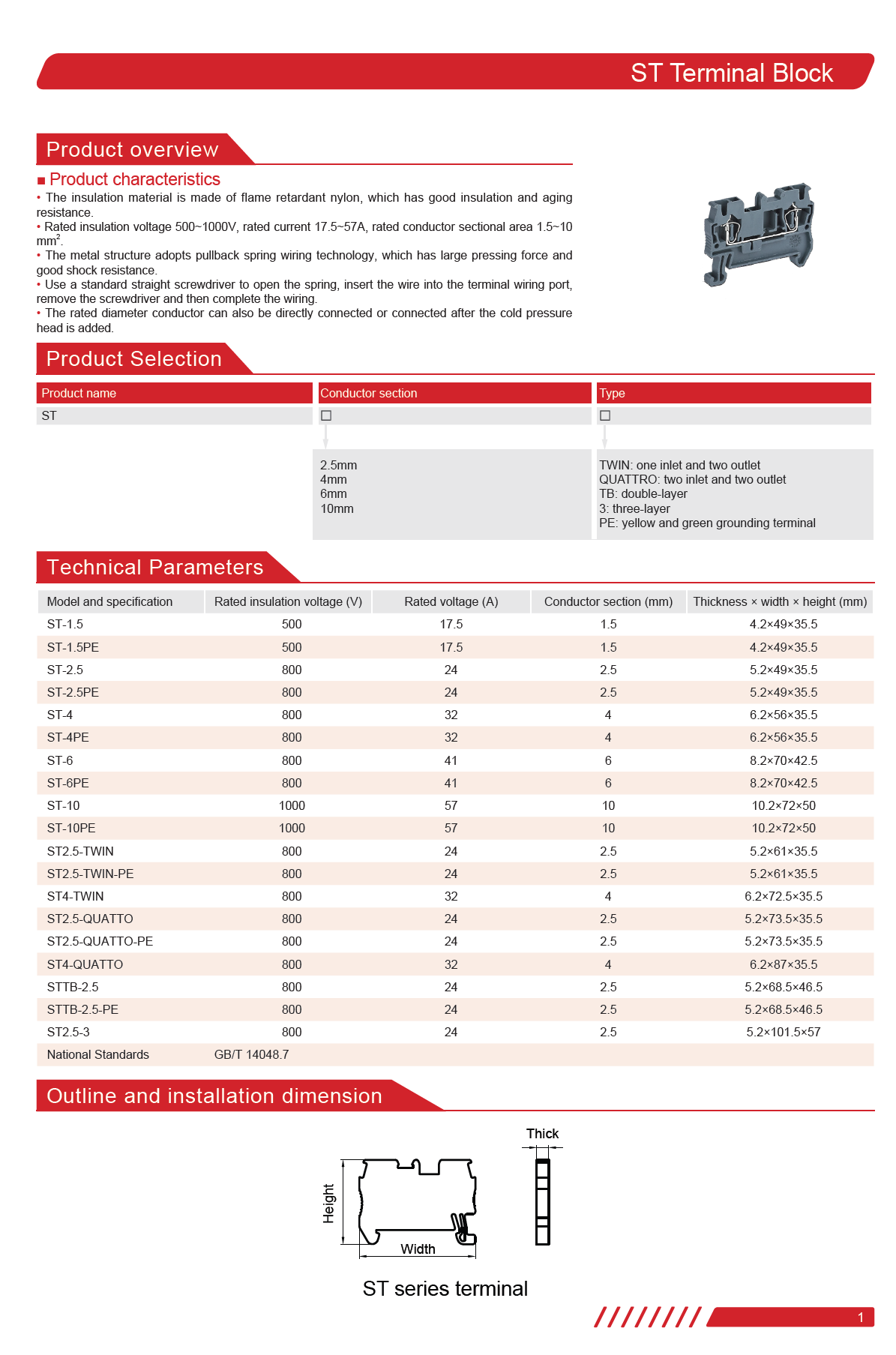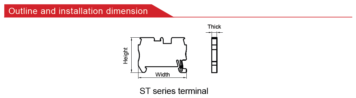 ST pull-back spring terminal block adopts a general spring wiring technology. With high compression force, excellent shock resistance and air tightness, this product can ensure the long-term stability of the wire connection. The compact top inlet provides more easy operation. The spring can be opened with a standard flathead screwdriver. Insert the wire into the terminal connector and remove the screwdriver, so the wiring connection is completed. The pull-back spring terminal has a large wiring capacity, the wire with a rated wire diameter can also be directly connected or connected via a cold press head. The insulation material adopts flame retardant nylon with good insulation and aging resistance; the rated operating voltage is 800V. The rated cross-sectional area of the connecting wire is 0.5 mm2 ~ 16 mm2.