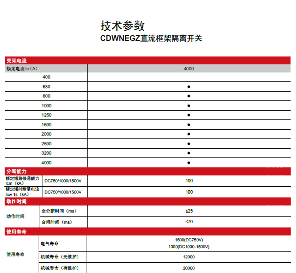 CDWNEGZ DC type switch disconnector is suitable for applications with rated current 630~4000A and rated operating voltage DC750V-DC1500V; it is mainly installed in low-voltage distribution circuit to turn on and off main circuit for isolation. It is widely used in centralized photovoltaic and energy storage industries.