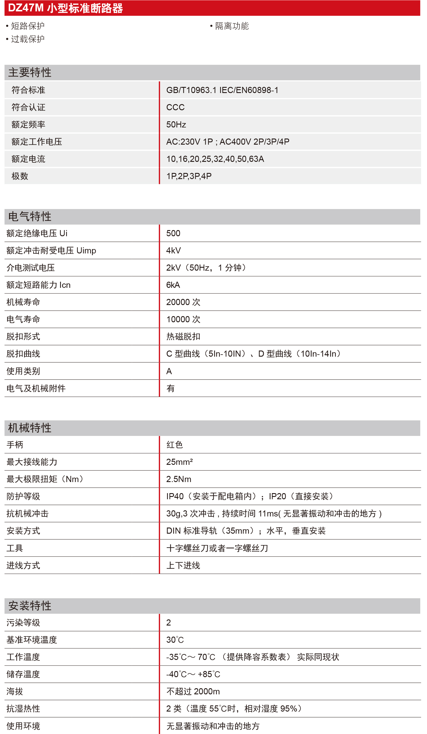 DZ47M is a "coal-to-electricity" dedicated miniature circuit breakers, suitable for AC 50HZ device with a rated voltage AC230/400V, and it has overload protection, short circuit protection and control isolation functions. It is not only suitable for conventional environments, but also suitable for special occasions such as motor starting, electric heating equipment, capacitor cabinets, high inductance and high capacitive loads, and high temperature environment, such as electric heating equipment including electric boilers and electric heaters.