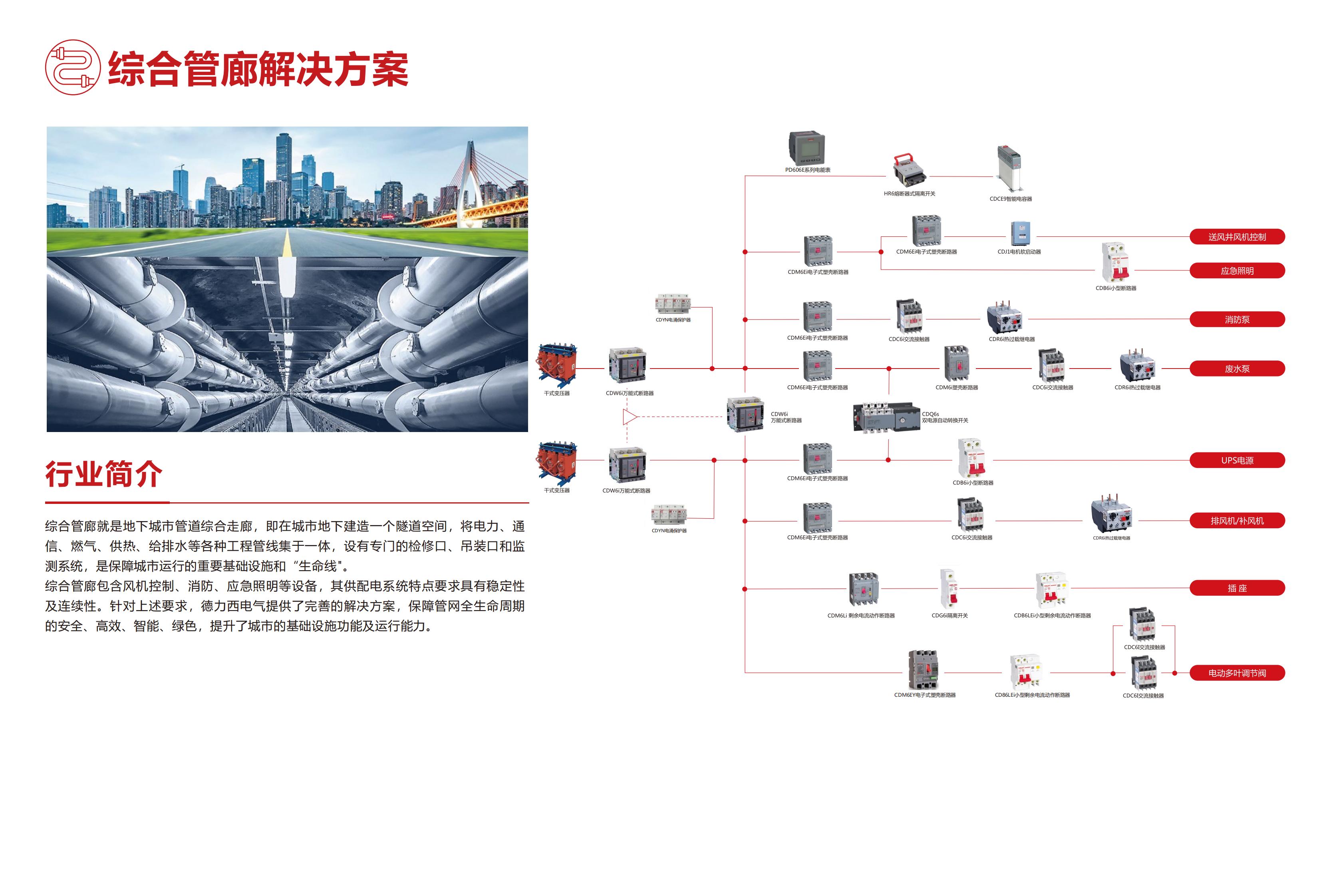 The utility tunnel includes fan control, fire protection, and emergency lighting, and its power supply and distribution system characteristics require stability and continuity. Aiming at the above requirements, Delixi Electric provides a perfect solution to guarantee the safety, efficiency, intelligence, and green of the pipe network throughout it’s whole life cycle, improving the city's infrastructure functions and operational capabilities.