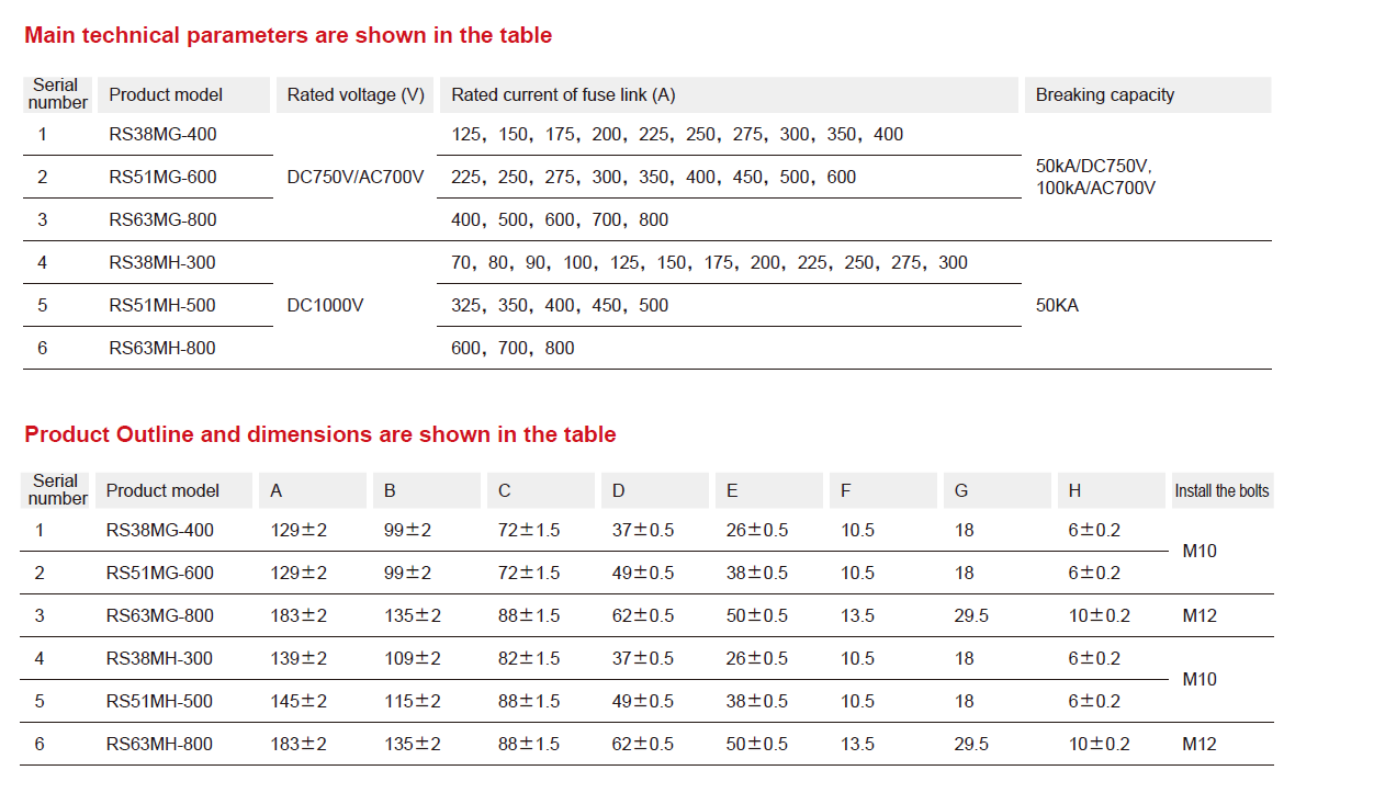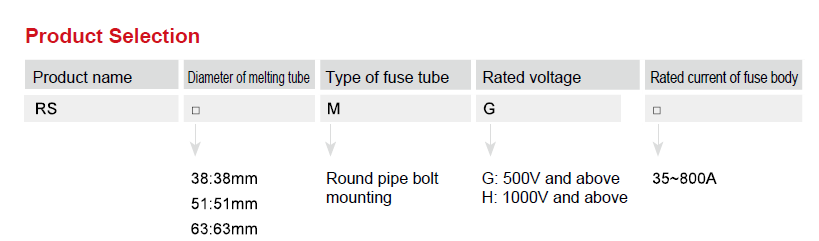RS38MG, RS51MG, RS63MG car charging pile fuse is suitable for electrical control devices with a rated voltage not exceeding 750V and a rated current of 800A such as car charging piles for short-circuit protection of semiconductor components and the complete sets of equipment composed of them.