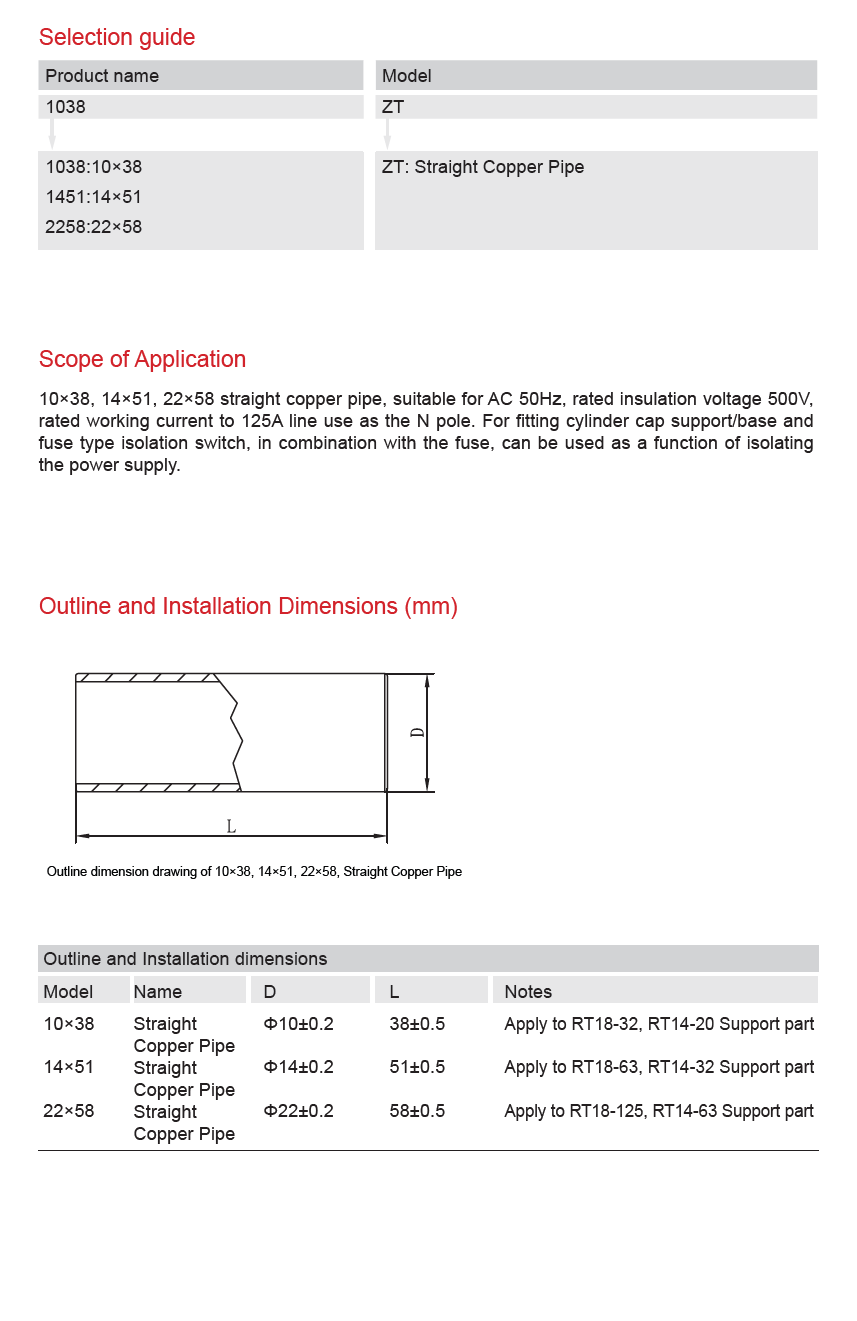 10×38, 14×51, 22×58 straight-through copper tube is suitable for AC 50Hz lines with a rated insulation voltage 500V and a rated operating current up to 125A as N pole. It is equipped with a cylindrical cap support / base and a fuse-type disconnector as an isolation power supply in conjunction with a fuse.
