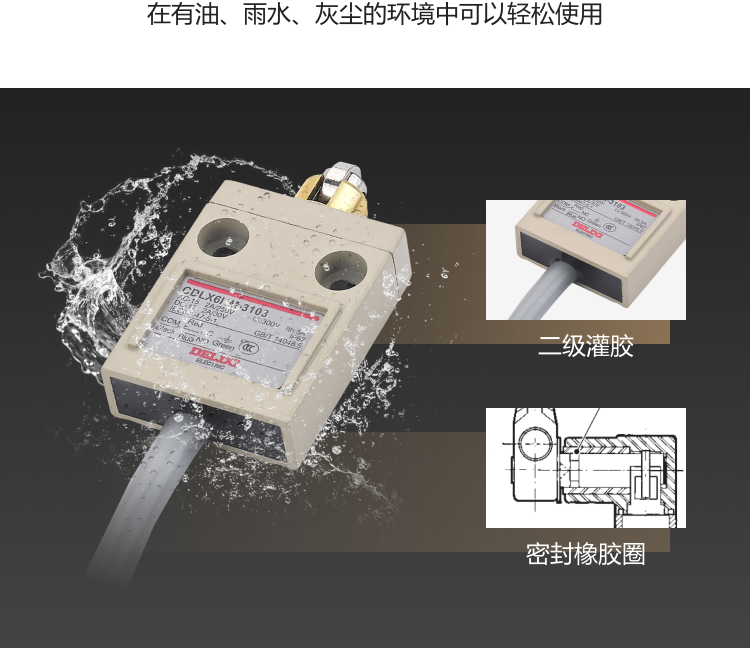 ? CDLX6HM防水限位開關(guān)集性能和顏值于一體,可完美控制運動機構(gòu)的行程、 變換運動方向及速度,憑借超高性能輕松應(yīng)對各類惡劣環(huán)境,適用于 50Hz/ 60Hz額定工作電壓至AC250V和直流電壓至DC30V的同極性使用的電氣線路。