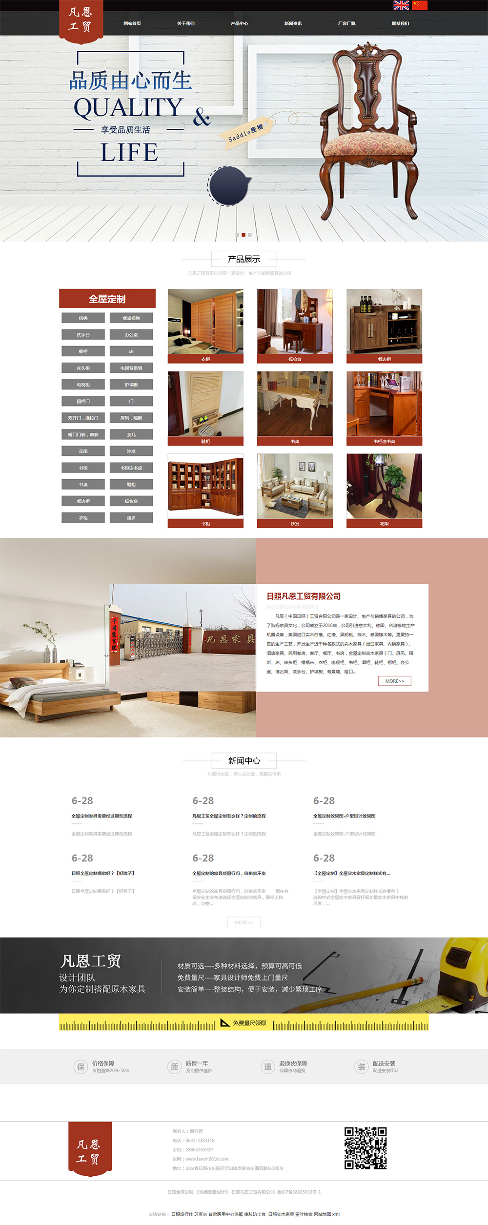 凡恩(中國日照)工貿有限公司是一家設計、生產與銷售家具的公司,為了弘揚家具文化,公司成立于2016年,公司引進意大利、德國、臺灣等地生產機器設備,美國進口實木白橡、紅橡、黑胡桃、櫸木、泰國橡木等。更秉持一貫的生產工藝,開發生產近千種各款式的實木家具(出口家具、內銷家具)、酒店家具、民用套房、客廳、餐廳、書房,全屋定制實木家具(門、屏風、隔斷、床、床頭柜、榻榻米、衣柜、電視柜、書柜、酒柜、鞋柜、櫥柜、辦公桌、博古架、洗手臺、護墻板、背景墻、啞口套、餐桌、餐椅、沙發、茶幾、花架)等產品:以質量好、款式多、價格