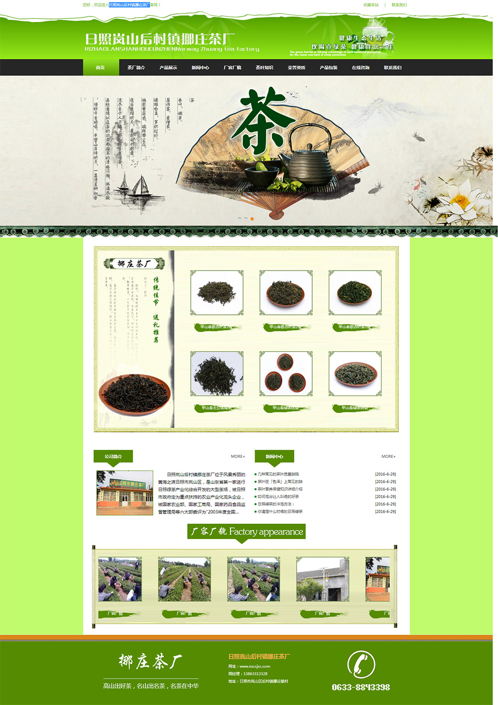 日照嵐山后村鎮挪莊茶廠位于風景秀麗的黃海之濱日照市嵐山區,是山東省第一家進行日照綠茶產業化綜合開發的大型茶場,被日照市政府定為重點扶持的農業產業化龍頭企業,被國家農業部、國家工商局、國家藥品食品監督管理局等六大部委評為"2003年度全國食品安全示范單位"中的唯一茶葉企業,被中國食品檢驗協會評為"國家質量檢測合格產品",被日照市工商局、質量技術監督局、衛生局等多家單位聯合評為"日照市消費者滿意單位"等榮譽,被中國消費者基金會評為"中國消費者信譽品牌",2005年在中國第三屆(日照)國際茶博覽會名優茶評選中再
