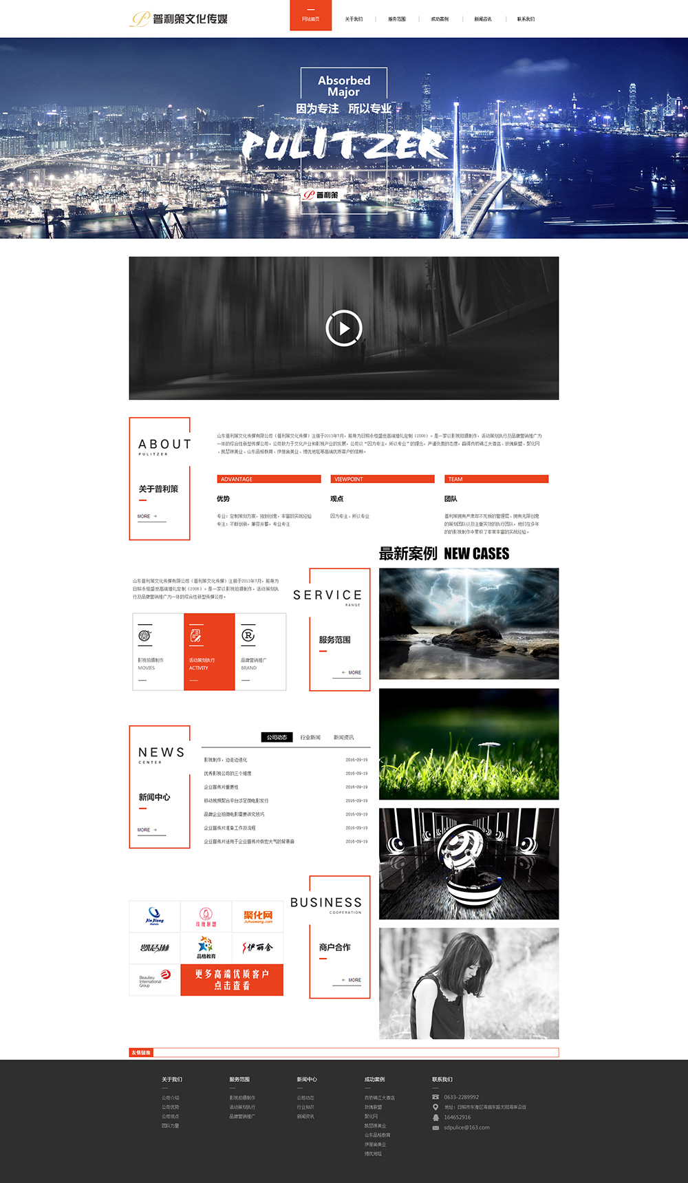 • v山東普利策文化傳媒有限公司(普利策文化傳媒)注冊(cè)于2013年7月,前身為日照永 恒盛世高 端婚禮定制(2008)。是一家以影視拍攝制作,活動(dòng)策劃執(zhí)行及品牌營銷推廣為一體的綜合性新型傳媒公司。公司下置:策劃部,市場部,影視部及設(shè)計(jì)部四個(gè)部門。注冊(cè)3年來,致力于文化產(chǎn)業(yè)和影視產(chǎn)業(yè)的發(fā)展,公司以“因?yàn)閷?注,所以專 業(yè)”的理念,嚴(yán)謹(jǐn)負(fù)責(zé)的態(tài)度,獲得了廣大 客戶的贊許和好評(píng)。