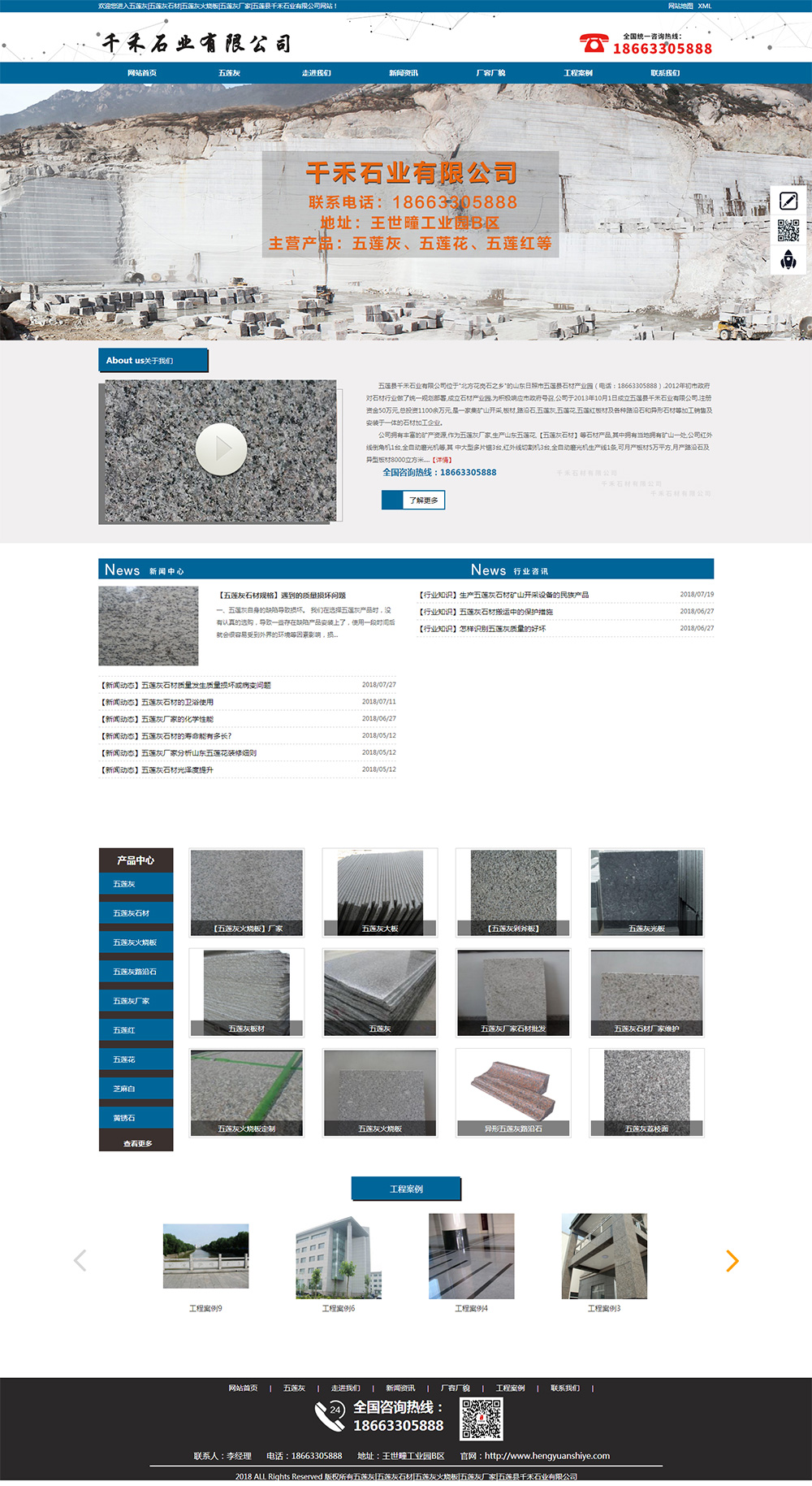 • 五蓮縣千禾石業(yè)有限公司位于"北方花崗石之鄉(xiāng)"的山東日照市五蓮縣石材產(chǎn)業(yè)園(電話:18663305888).2012年初市政府對(duì)石材行業(yè)做了統(tǒng)一規(guī)劃部署,成立石材產(chǎn)業(yè)園.為積極響應(yīng)市政府號(hào)召,公司于2013年10月1日成立五蓮縣千禾石業(yè)有限公司.注冊(cè)資金50萬元,總投資1100余萬元,是一家集礦山開采,板材,路沿石,五蓮灰,五蓮花,五蓮紅板材及各種路沿石和異形石材等加工銷售及安裝于一體的石材加工企業(yè).