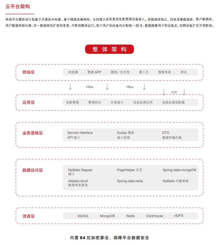 德力西電氣云平臺(tái)電能管理系統(tǒng)可以實(shí)現(xiàn)用戶(hù)電費(fèi)遠(yuǎn)程支付及自動(dòng)抄表管理,實(shí)現(xiàn)電能表遠(yuǎn)程自動(dòng)抄表、預(yù)付費(fèi)或后付費(fèi)、統(tǒng)計(jì)及分析功能。本系統(tǒng)采用云服務(wù)器模式,電表采用 RS485 總線(xiàn)轉(zhuǎn)無(wú)線(xiàn)網(wǎng)關(guān)方式,是德力西電氣自主研發(fā)的智能電表遠(yuǎn)程集抄管理系統(tǒng),具有系統(tǒng)參數(shù)設(shè)置、開(kāi)戶(hù)、配表、充值、換表、銷(xiāo)戶(hù)、查詢(xún)、報(bào)表等功能,具有系統(tǒng)數(shù)據(jù)備份和恢復(fù)功能,具有用戶(hù)管理功能。德力西云平臺(tái)電能管理系統(tǒng)由云服務(wù)器、智能網(wǎng)關(guān)、智能電表三個(gè)部分構(gòu)成。