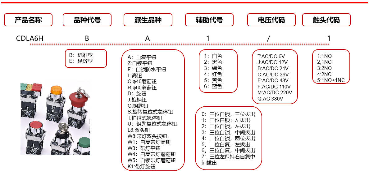 CDLA6H button is suitable for the AC 50/60HZ mechanical equipment with rated voltage 380V and 220V or AC and DC rated voltage 220V and below as switching control. This product belongs to the industrial equipment and switch category of industrial control products.