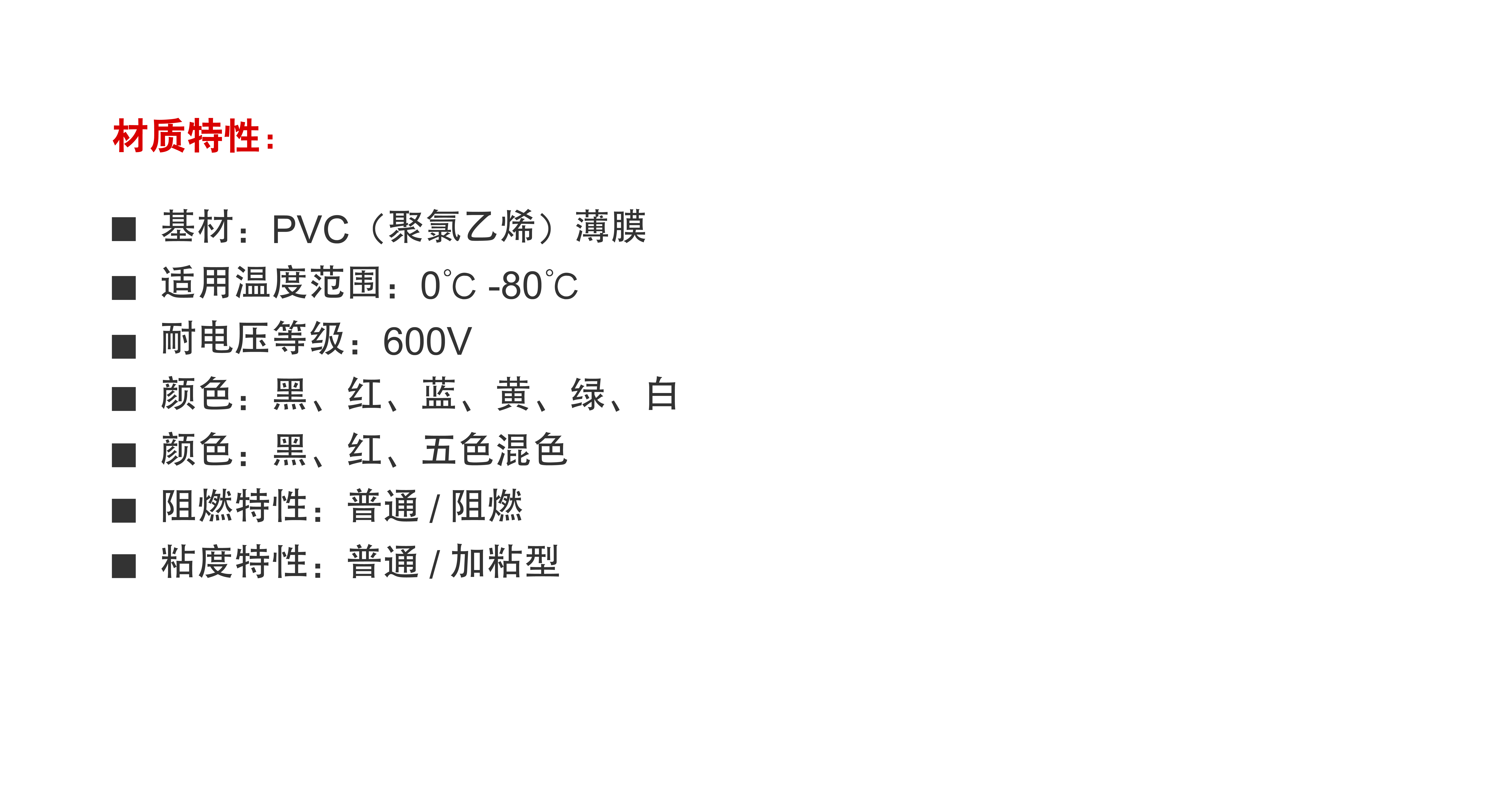 Suitable for wire joint insulation protection and wire identification Glossy or matte surface, soft and elastic material With high mechanical strength, good acid and alkali corrosion resistance With excellent adhesion and electrical insulation properties