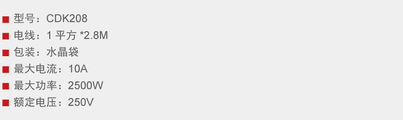 Home page >Products >Power Distribution Products >Final Distribution >Socket >(Extension Cord, Wireless, Functional) Socket >CDK 208 Extension Cord Socket (New GB)