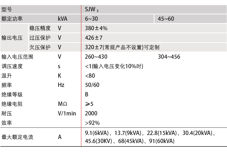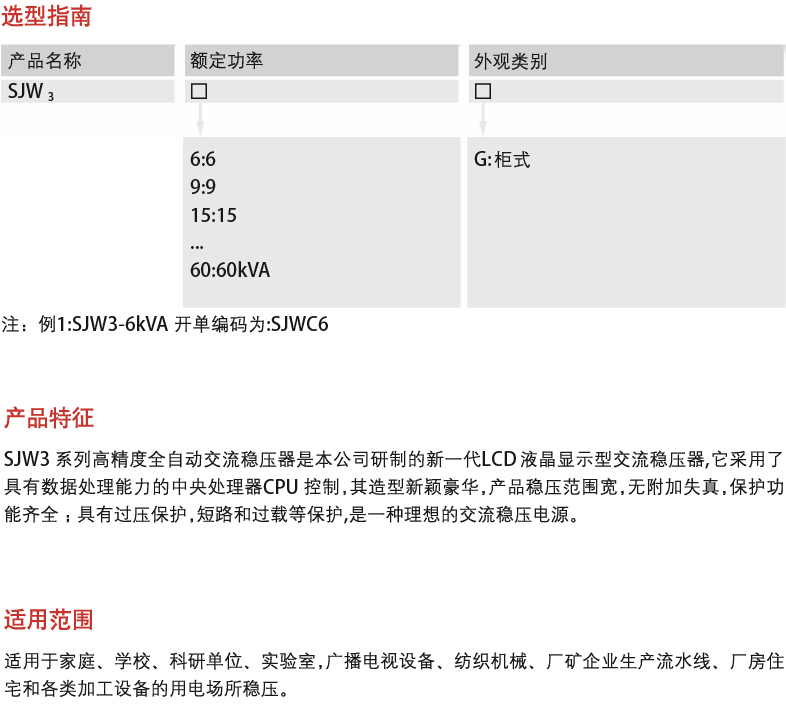 SJW3 series high-precision automatic AC regulator is a new generation LCD display type AC regulator developed by the company, and central processing unit CPU control with data processing capabilities is used. The product features with novel and luxurious appearance, wide voltage regulation range, no additional distortion, and complete protection functions; it is an ideal AC regulated power supply with its overvoltage protection, short circuit and overload protection.