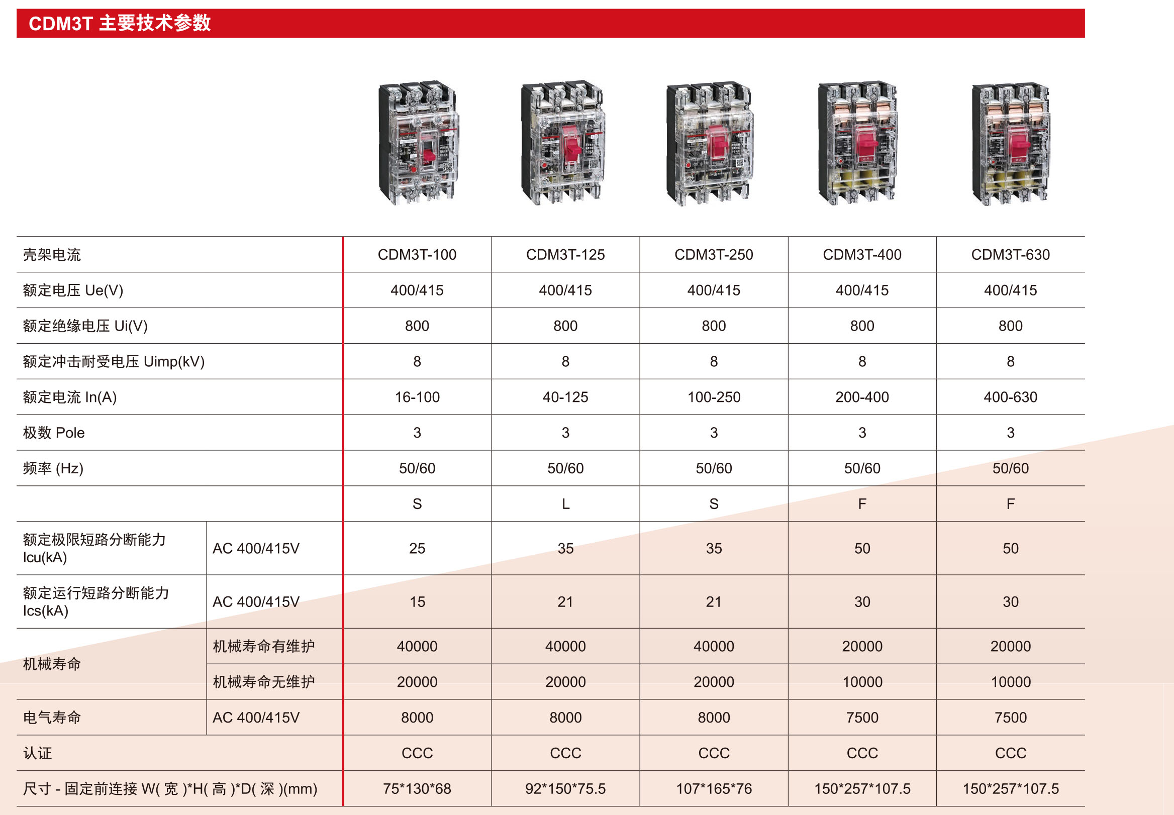 The new CDM3T series moulded case circuit breaker products are suitable for AC circuits with a rated working voltage AC400/415V and a rated current of 16-630A. With high-quality, transparent and visible products, provide stable electrical protection for temporary power consumption places in industry, commerce, civil buildings, and infrastructure. It is used for electric energy distribution and lines and power equipment protection to avoid damage caused by faults such as overload and short circuit.