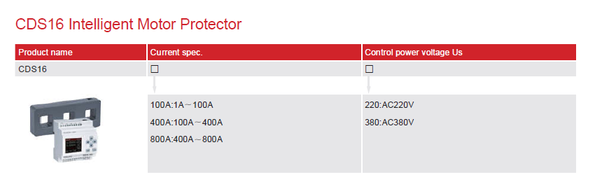 CDS16 motor protector series products have complete protection functions, and its LED screen can clearly display various detection parameters, and RS485 communication interface is equipped. It is suitable for AC 50HZ power supply circuit with a voltage 380V and below, and form a motor control circuit together with the switching circuit such as AC contactor.