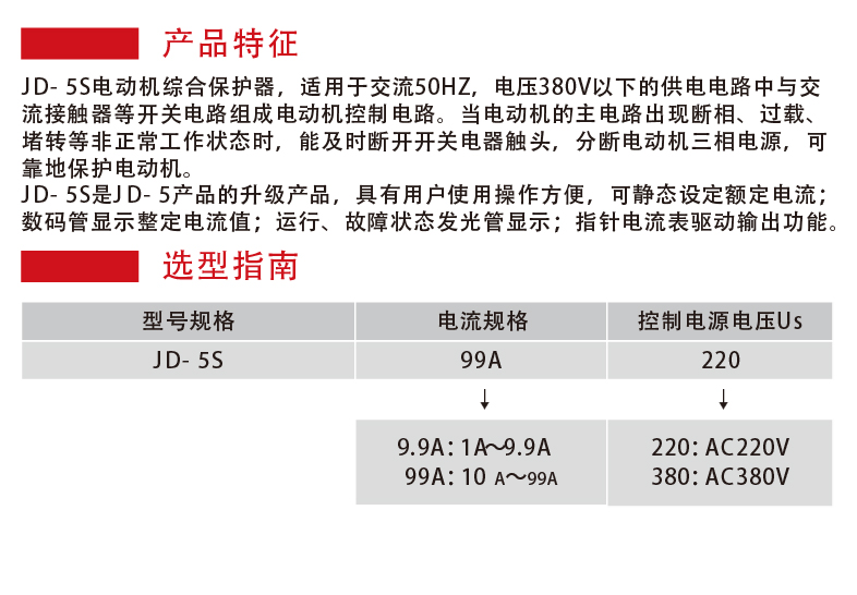 JD-5S motor integrated protector is suitable for AC 50H power supply circuit with a voltage 380V and below to form a motor control circuit together with AC contactor. In case of abnormal work state of main circuit of motor such as phase loss, overload, and stall, it can disconnect the electrical contact of switch, turn off the three-phase power supply of motor, and reliably protect the motor. JD-5S is an upgrade of JD-5 product with convenient operation by user, and its rated current can be set statically; the digital tube displays the setting current value; the run and fault state light-emitting tube is used to display, and the pointer ammeter drives the output function.