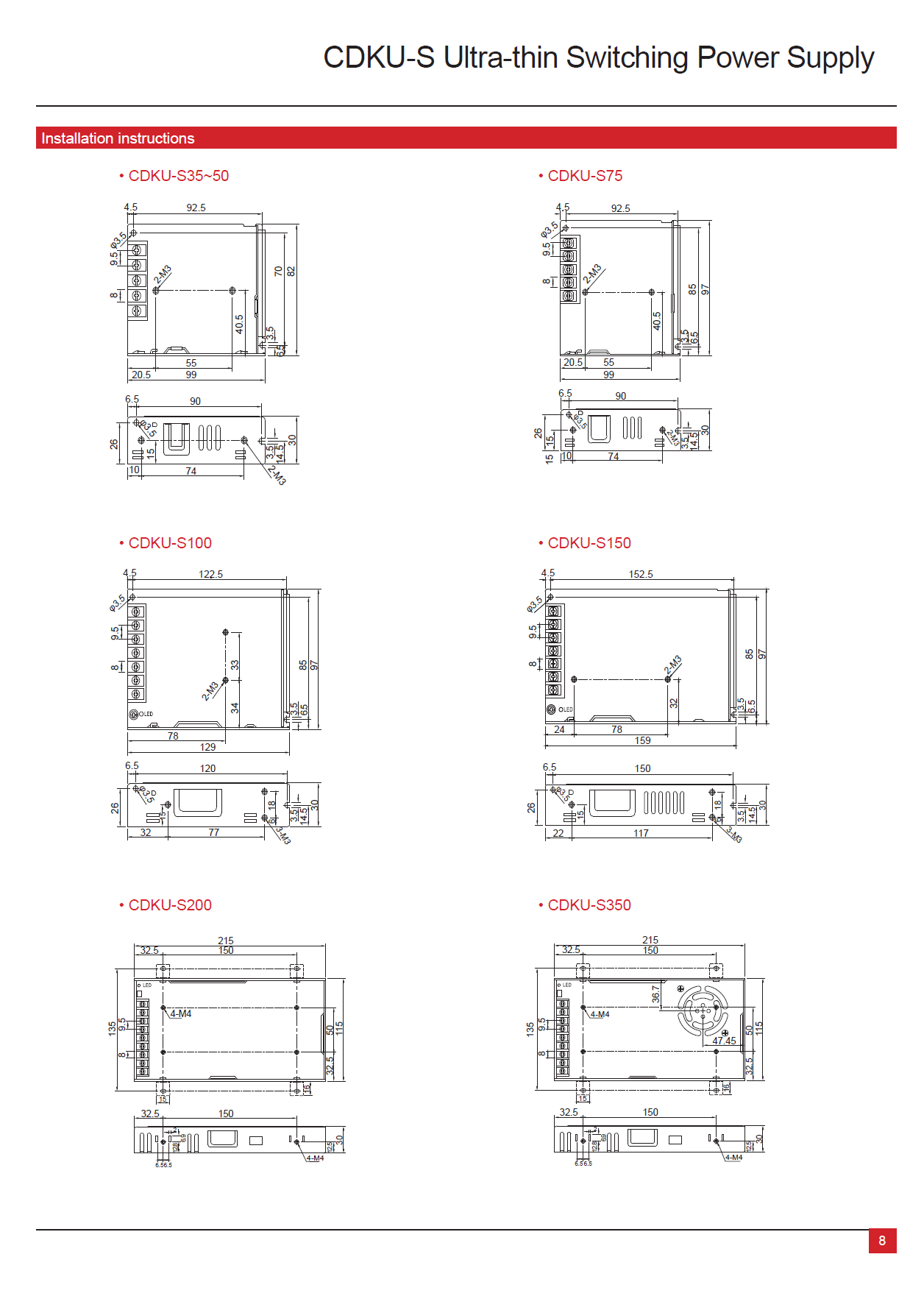 CDKU-S series products are single-output enclosed switching power supplies with 30mm ultra-thin design, and adopt 90-264VAC full range input voltage (toggle switch optional for 200W and 350W). Any set of 5V, 12V, 24V, 36V, and 48V single outputs (special requirements can be customized) can be selected. The product adopts full-metallized shell and honeycomb heat dissipation design with good heat dissipation performance; the product can work normally in the environment of -30℃ ~ 70℃ temperature and 20% ~ 90% RH relative humidity, with the efficiency up to 89% and the no-load power consumption as low as 0.2 ~ 1.0W, and they can meet international energy requirements.
