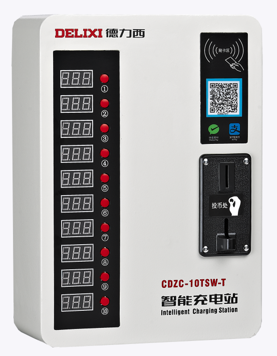 CDZC-10(SW)-T and CDZC-10(SW)-TC series adjustable intelligent charging station is a charge-type charging management equipment designed and developed by Delixi Electric Co., Ltd. for safe charging of electric bicycles and for convenient property management. This series of products has four consumption modes: traditional direct charge, pay-by-card, coin (one coin), and QR code payment. With remote background management functions added, it supports remote modification of payment parameters, remote query of consumption revenue records, and remote renewal; with simple operation and convenient use, this equipment is the preferred equipment for electric bicycle charging management in many places such as residential community, public parking lots, large shopping malls, and units.