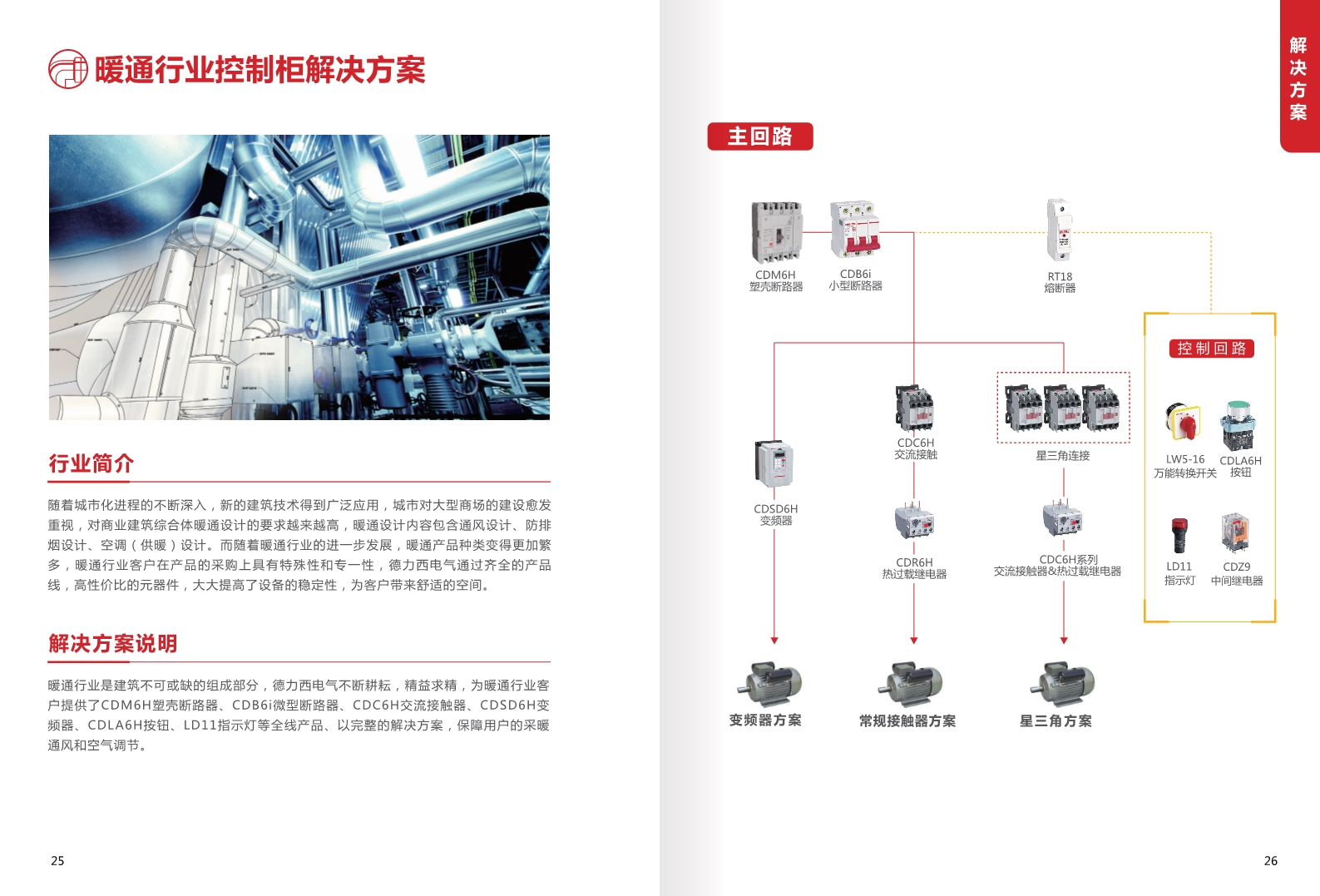 暖通行業(yè)是建筑不可或缺的組成部分,德力西電氣不斷耕耘,精益求精,為曖通行業(yè)客戶提供了CDM6H塑殼斷路器、CDB6i微型斷路圈、CDC6H交流接觸器.CDSD6H變頻器、CDLA6H按鈕、LD11指示燈等全線產(chǎn)品、以完整的解決方案,保障用戶的采暖通風(fēng)和空氣調(diào)節(jié)。
