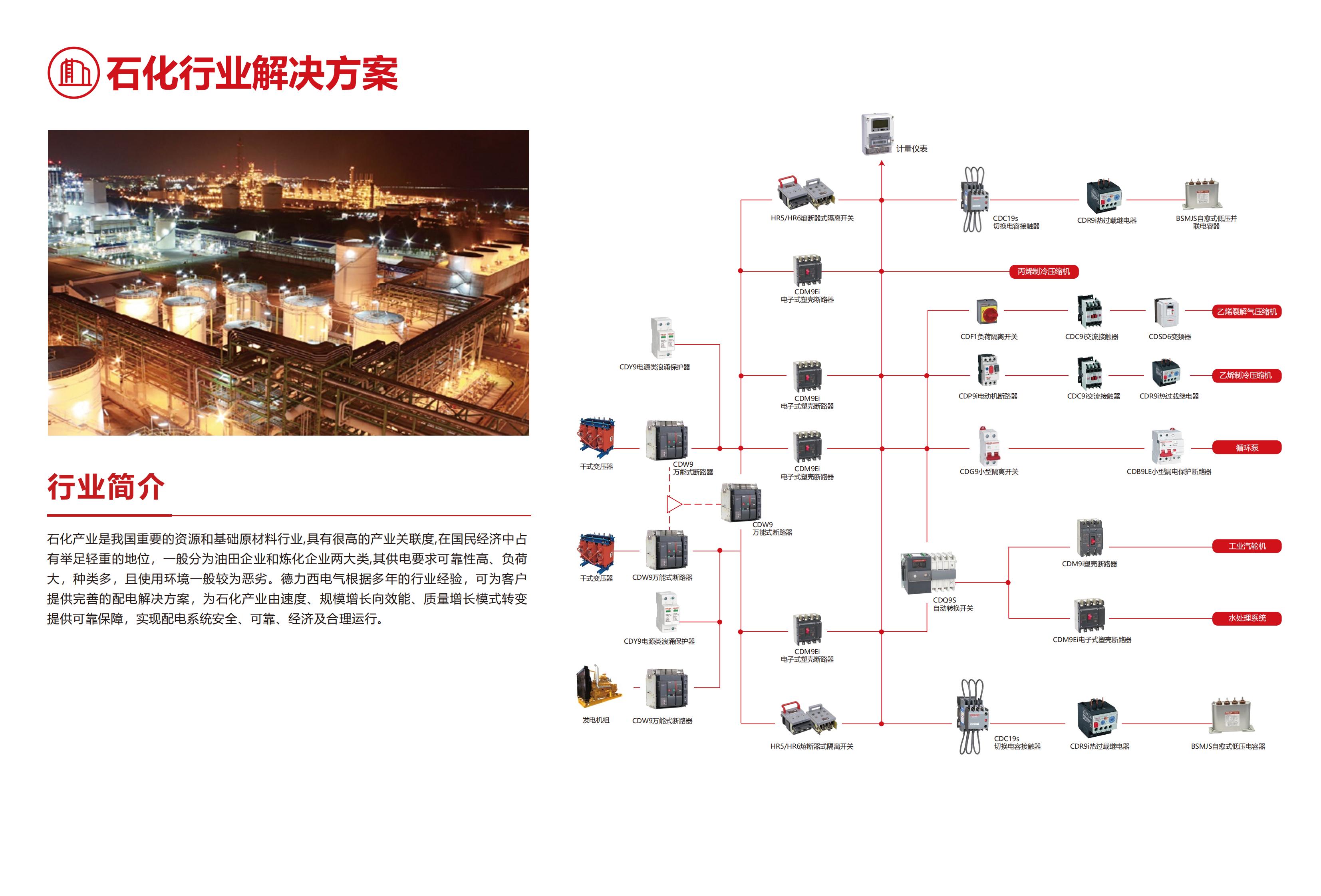 石化產(chǎn)業(yè)是我國(guó)重要的資源和基礎(chǔ)原材料行業(yè),具有很高的產(chǎn)業(yè)關(guān)聯(lián)度,在國(guó)民經(jīng)濟(jì)中占有舉足輕重的地位,一般分為油田企業(yè)和煉化企業(yè)兩大類,其供電要求可靠性高、負(fù)荷大,種類多,且使用環(huán)境一般較為惡劣。德力西電氣根據(jù)多年的行業(yè)經(jīng)驗(yàn),可為客戶提供完善的配電解決方案,為石化產(chǎn)業(yè)由速度、規(guī)模増長(zhǎng)向效能、質(zhì)量増長(zhǎng)模式轉(zhuǎn)變提供可靠保障,實(shí)現(xiàn)配電系統(tǒng)安全、可靠、經(jīng)濟(jì)及合理運(yùn)行。
