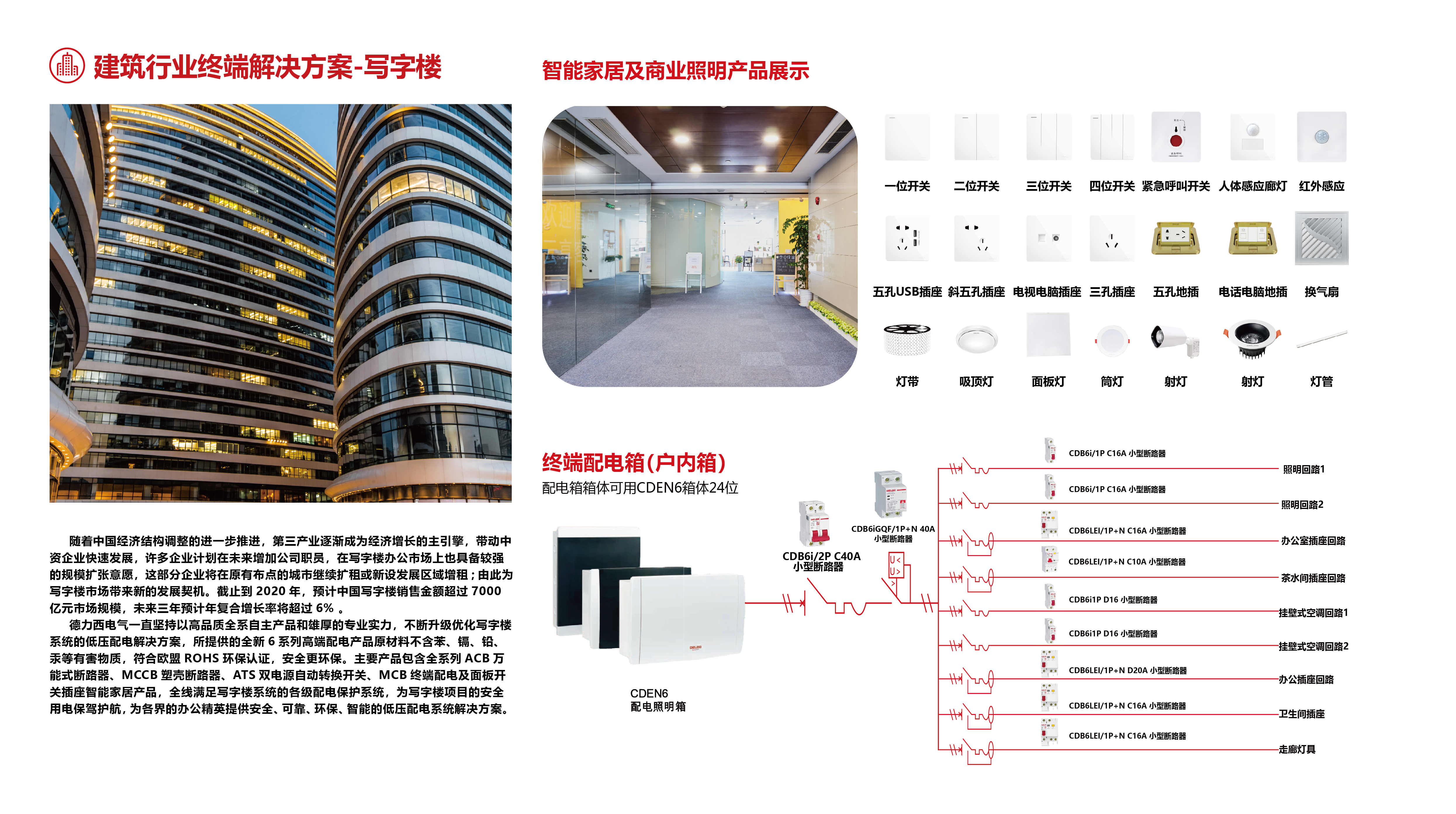 德力西電氣一直堅(jiān)持以高品質(zhì)全系自主產(chǎn)品和雄厚的專業(yè)實(shí)力,不斷升級(jí)優(yōu)化寫字樓系統(tǒng)的低壓配電解決方案,所提供的全新6系列高端配電產(chǎn)品原材料不含苯、鎘、鉛、汞等有害物質(zhì),符合歐盟ROHS環(huán)保認(rèn)證,安全更環(huán)保。主要產(chǎn)品包含全系列ACB萬能式斷路器、MCCB塑殼斷路器、ATS雙電源自動(dòng)轉(zhuǎn)換開關(guān)、MCB終端配電及面板開關(guān)插座智能家居產(chǎn)品,全線滿足寫字樓系統(tǒng)的各級(jí)配電保護(hù)系統(tǒng),為寫字樓項(xiàng)目的安全用電保罵護(hù)航,為各界的辦公精英提供安全、可靠、環(huán)保、智能的低壓配電系統(tǒng)解決方案。